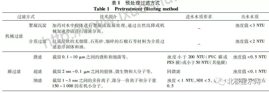 废水的过滤方式有很多,主要分为两类,机械过滤和膜过滤,机械过滤通过絮凝、吸附、沉降等方法实现对原水的过滤;预处理中膜过滤是一种根据膜孔径大小选择透过的过程,膜充当过滤网的作用,原液在一定的压力下从过滤网流过,只允许水分子及一些极细小的微粒通过形成透过液,而原液中大于过滤膜孔径的物质则被截留,形成浓缩溶液,实现对原液的分离。目前膜分离技术在废水资源化利用方面产生了巨大的经济和社会效益。表1列出了可以选用的脱硫废水过滤技术及其特点。